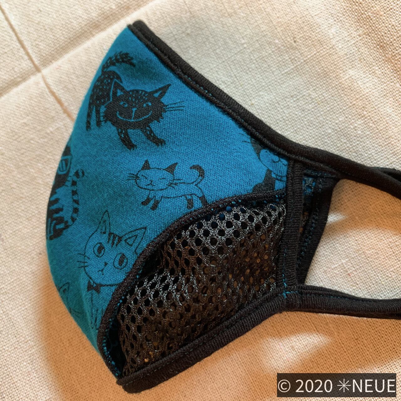 猫柄がかわいい、肌触りの良いコットン素材の表地と、通気性、速乾性に優れたソフトメッシュの裏地が特徴のマスクです。