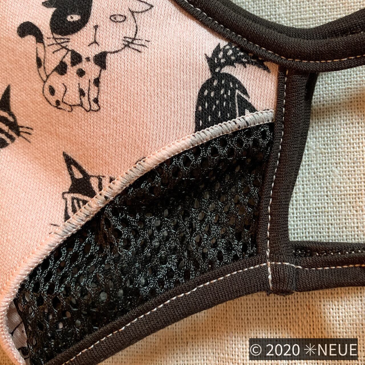 猫柄がかわいい、肌触りの良いコットン素材の表地と、通気性、速乾性に優れたソフトメッシュの裏地が特徴のマスクです。
